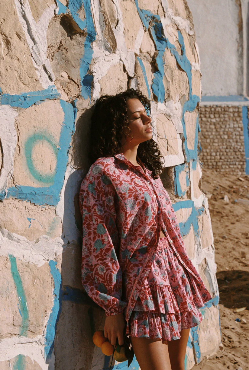 The Kamala Block Print Fae Frill Skort brings playful movement and handcrafted character to an easy summer silhouette. Designed with a soft, gathered waistband and layered frill hem, the piece combines the ease of shorts with the feminine feel of a skirt.