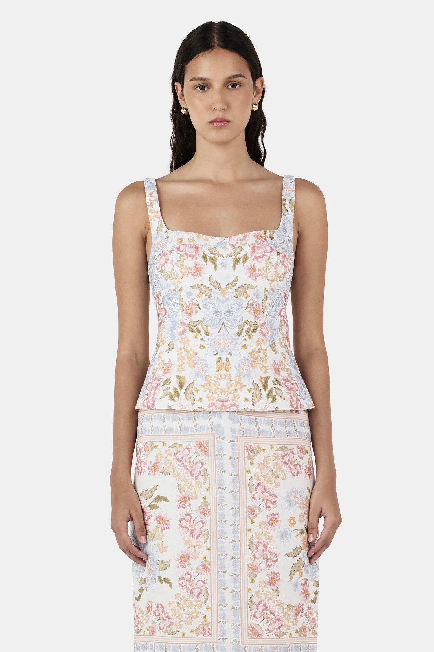 The Ellie Linen Top features a structured scoop neck bodice with wide straps that curve into a flattering neckline. Vertical seaming and an underbust seam enhance the shape and provide a contoured fit. Finished with a clean invisible zipper at the centre back.