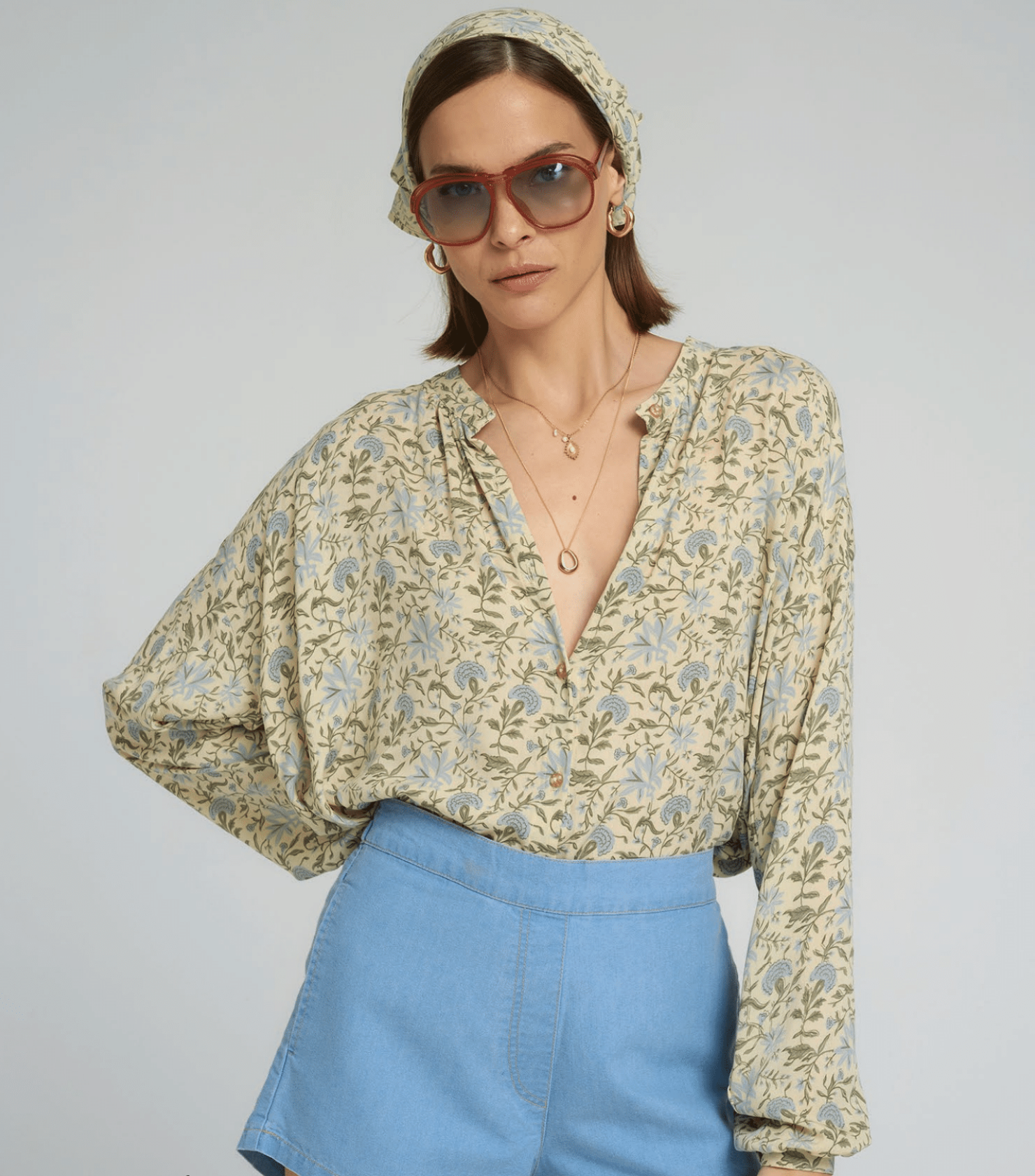 When it comes to wardrobe staples, the Ginger Shirt has you covered. This classic button down cotton shirt comes in this great new Fleur Des Champs print. Team with your favourite jeans, denim shorts or a cargo pant to pick up the green in the print. This shirt has a loose body, a Nehru neckline and long sleeves, and can be worn loose or tucked in. Roll the sleeves and you're off in style.