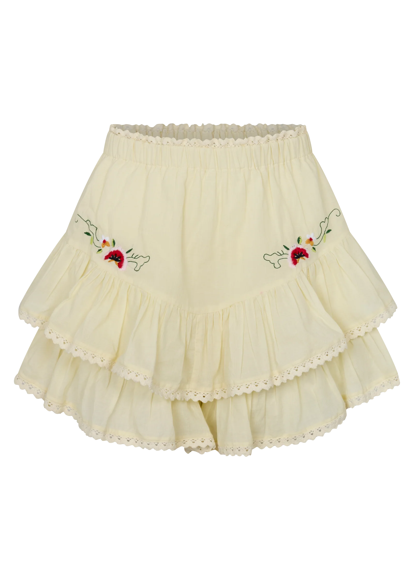 Crafted from lightweight, breathable cotton, it sits comfortably at the waist with a relaxed, easy fit. Layered frills add gentle movement, while the embroidered motifs bring a handcrafted feel.
