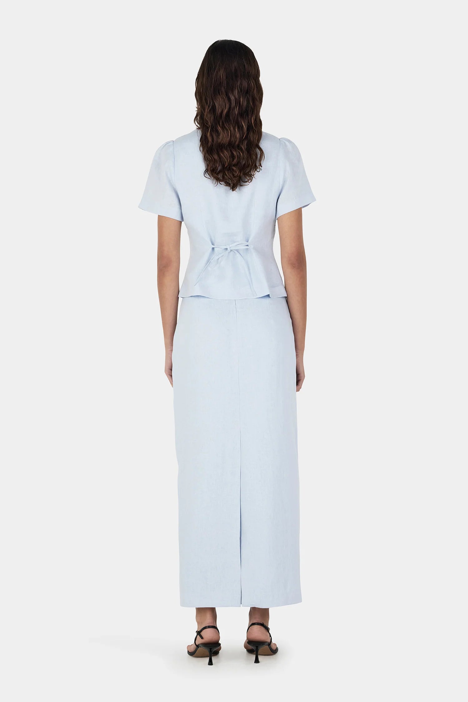 The Sellar Linen Top features a fitted bodice with front and back princess seams for a flattering shape. It has a scoop neckline and short sleeves gathered at the shoulder for a soft detail. Fabric-covered buttons run down the center front, and a tie at the back waist allows for an adjustable fit. The hem finishes at the high hip, making it perfect for pairing with high-waisted styles. Pair with the matching Marielle Skirt for a chic tonal set.