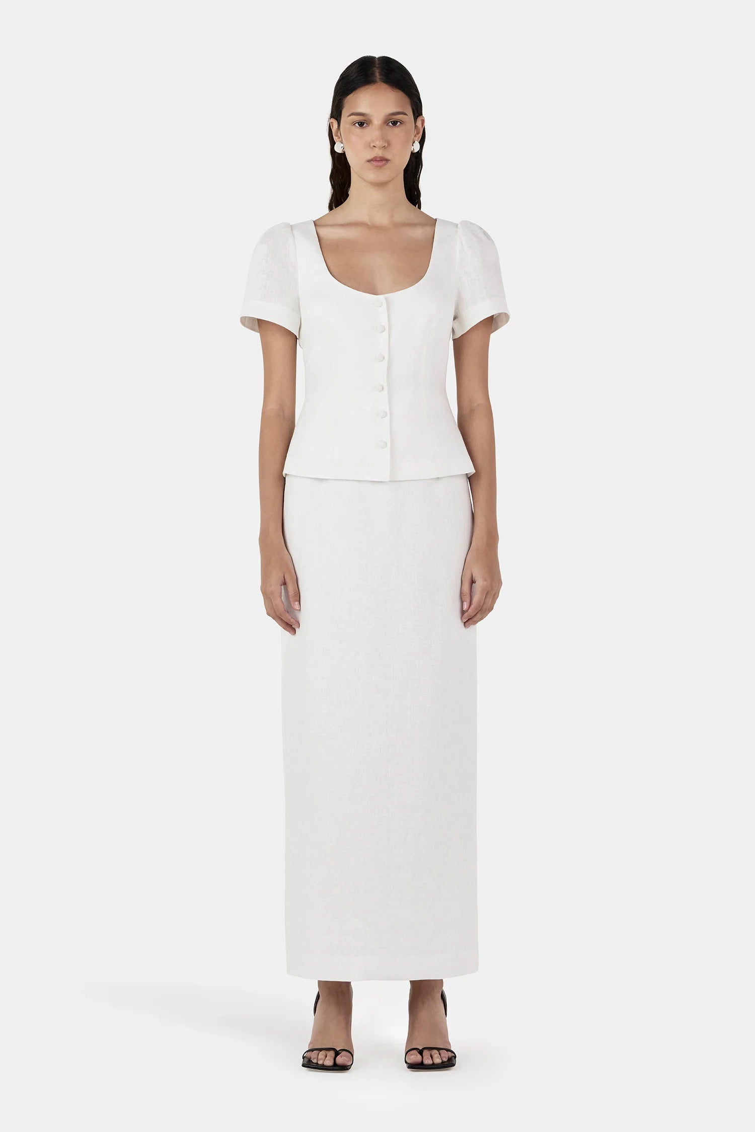 The Sellar Linen Top features a fitted bodice with front and back princess seams for a flattering shape. It has a scoop neckline and short sleeves gathered at the shoulder for a soft detail. Fabric-covered buttons run down the center front, and a tie at the back waist allows for an adjustable fit. The hem finishes at the high hip, making it perfect for pairing with high-waisted styles. Pair with the matching Marielle Skirt for a chic tonal set.